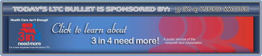 LTC Bullet: The CLASS Act and the Future of LTC Financing Tuesday, January 18, 2011 Seattle-- LTC Comment: Watch, listen and read why CLASS is doomed but LTC financing will improve, after the ***news.*** *** YOU READ IT HERE FIRST. We've argued for decades that a cresting Age Wave will swamp entitlements like Medicare and Medicaid and leave aging boomers much more reliant on private financial products. It's happening . . . NO MORE FREE HOME HEALTH. "Medicare recipients could see a sizable new out-of-pocket charge for home health visits if Congress follows through on a recommendation issued Thursday by its own advisory panel." More. MEDICAID PAYS LESS THAN MINIMUM WAGE. "State Medicaid programs underfunded nursing homes by $5.6 billion last year. They paid an average of $7.17 per hour, per patient, which is less than the minimum wage of $7.25 per hour, according to a new study." More. MEDICARE CUTBACKS IMPERIL MEDICAID SNFs. "The Medicare Payment Advisory Commission (MedPAC) has recommended that Congress not provide a cost-of-living increase, also known as a market-basket update, for skilled nursing facilities in fiscal year 2012." More. POOR HURT MOST. "Over the last 10 years, nursing home closures have hit poor, urban and minority communities especially hard, according to a new study from Brown University." More. "We are heading to a two-class society, those who can pay and those dependent on whatever government programs exist," says AALTCI's Jesse Slome. More. *** *** AGING DELIBERATELY. From time to time we've pointed you toward Liz Taylor's excellent newsletter. Now, Aging Deliberately, has won third place--behind only the AARP Bulletin and Los Angeles Jewish Home eNews--in a nationwide Best of the Web 2011 competition. More. Congratulations, Liz! Join Liz Taylor's mailing list here. ***