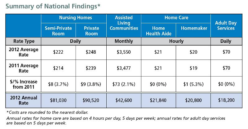 Chapter 6: Long-Term Care FinancingCost of Care Surveys MetLife Cost of Care Survey 2012 URL: https://www.metlife.com/assets/cao/mmi/publications/studies/2012/studies/mmi-2012-market-survey-long-term-care-costs.pdf “According to the newly released 2012 MetLife Market Survey of Nursing Home, Assisted Living, Adult Day Services and Home Care Costs, conducted for the tenth year by the MetLife Mature Market Institute, national average rates for long-term care in the U.S. continue to rise. The average cost of a semi-private room in a nursing home rose 3.7% in 2012, from $214 daily or $78,110 annually in 2011, to $222 or $81,030 annually. Assisted living base rates increased by 2.1%, from $3,477 monthly or $41,724 annually to $3,550 or $42,600 annually. The average rate for a homemaker increased by 5.3%, from $19 to $20 per hour. Only rates for home health aides and adult day services were unchanged year-to-year, remaining at $21 per hour and $70 per day respectively.”
