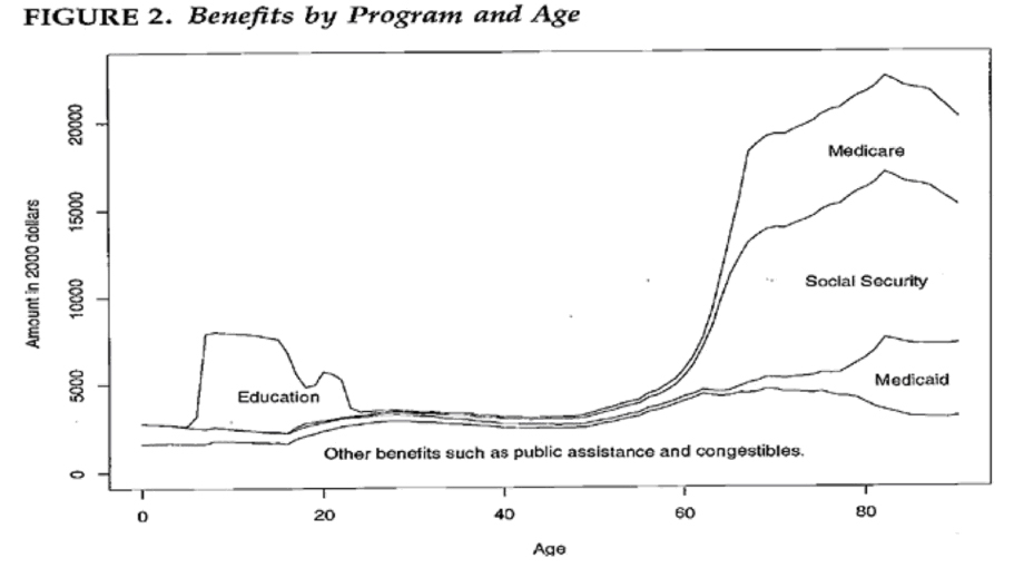 The coming decades—due to the rising support ratios from the aging boomers—will experience a demographic headwind of (very roughly—these will be wildly out-of-sample conditions) roughly the same 1%. So, if 3% growth was normal, 1% growth (again, very roughly) becomes normal. This is the reason behind my concerns regarding the legacy of monetary and fiscal experiments, and debt and deficits we leave our children. So even without a fiscal calamity, Demographic Winter alone will have the economy at stall speed. A little economic hiccup will quickly send the economy into a recession or even depression. Uncle Sam has already run up an $18.1 trillion dollar tab, but adding insult to injury Demographic Winter will create another fiscal tsunami. The Fiscal Costs of Demographic Winter In addition to the overall negative economic impact, Demographic Winter will also have a negative fiscal impact on federal, state, and local governments. First, people over the age of 65 impose significantly more costs to government than younger age cohorts. Figure 2 (Figure 1 omitted) shows that a typical person over the age of 65 costs government nearly three times as much as a person under the age of 18—even with educational costs factored in.