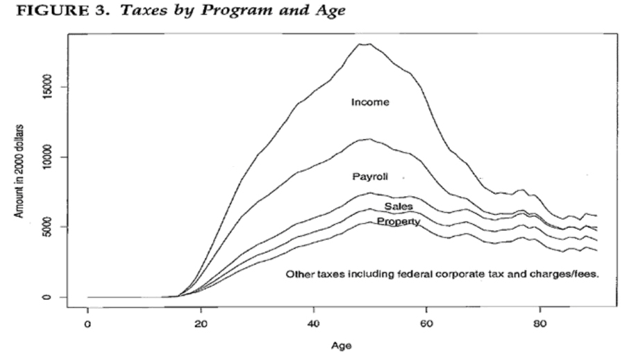 While these costs predominantly fall on the federal government (Social Security and Medicare), state governments should be prepared for a significant spike in Medicaid costs for those over the age of 65, especially driven by the cost of nursing homes. Second, while expenses soar for those over the age of 65, the taxes paid by this age cohort drop by two-thirds as shown in Figure 3. The primary culprits for this drop are the payroll and income tax, which naturally decline as people retire from the labor force. As such, the primary fiscal concern for state policymakers moving forward is the eroding income tax base as the county continues to age. [N.B. our study state, New Hampshire, has no income tax.]